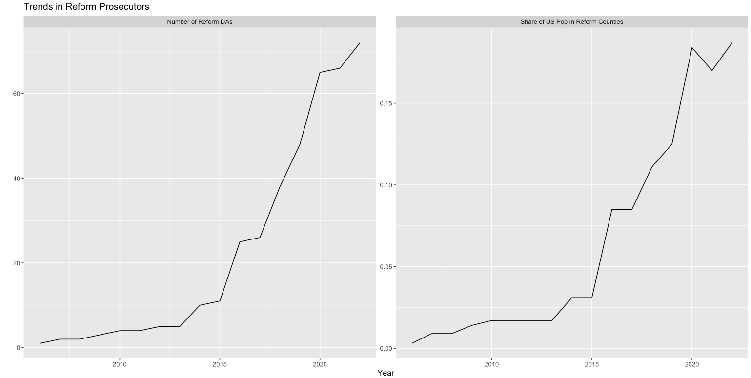 One of the more seismic shifts in the US criminal legal system has been the rise of the “progressive” or “reform” prosecutor.1 The first real high-profile reform victories were not even ten years ago, with Kim Foxx winning in Chicago in 2016, and Larry Krasner in Philadelphia in 2017.2,3 In those early days–just five or six years ago–only about 5% of the US population lived in counties with reformers.