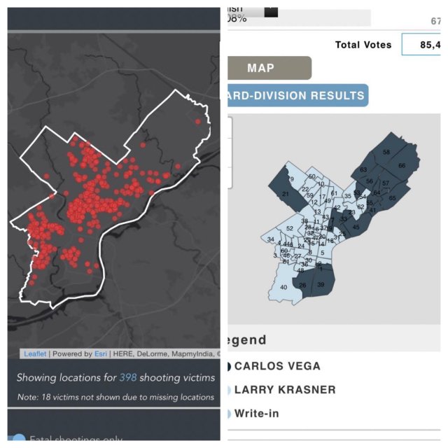 On the night of May 18, 2021, a racist tweet by an angry Philadelphian voter launched a whole new research agenda for me. As it became clear that evening that Larry Krasner had thoroughly defeated his Democratic primary challenger, Carlos Vega, a Vega supporter tweeted out the following pair of maps–of districts that went for Krasner alongside where shootings happen in Philly–with an angry “the definition of insanity” message.