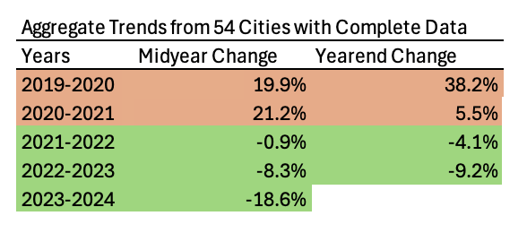 The MCCA has provided year-end crime data from ~70 departments every year since 2014, but it only started providing midyear data in 2020 (comparing it to midyear 2019).2 And while the MCCA has about 70 departments that report data, not every department reports every year, and those departments that do report do not always report a full 12 months of data. All told, fifty-four departments provided complete mid-year and year-end data every year from 2019 to 2024. The table below provides the aggregate midyear and yearend homicide totals for those departments.