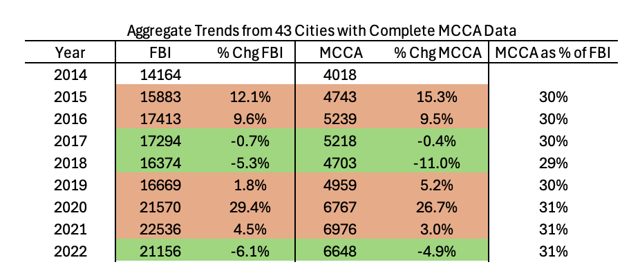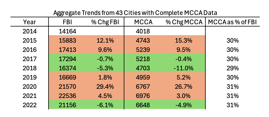 But can we extrapolate the results from a handful of departments to the US as a whole? At first blush, it’s not a crazy idea. Crime is really concentrated, so the departments in major cities handle a lot of the nation’s cases. It’s still not, however, the sort of point one can just assert. The next table thus compares yearend homicide trends in the MCCA to those from the FBI. Here, I am using even fewer cities than in the previous one, since only 43 departments provided complete data to the MCCA every year from 2014 to 2023.
