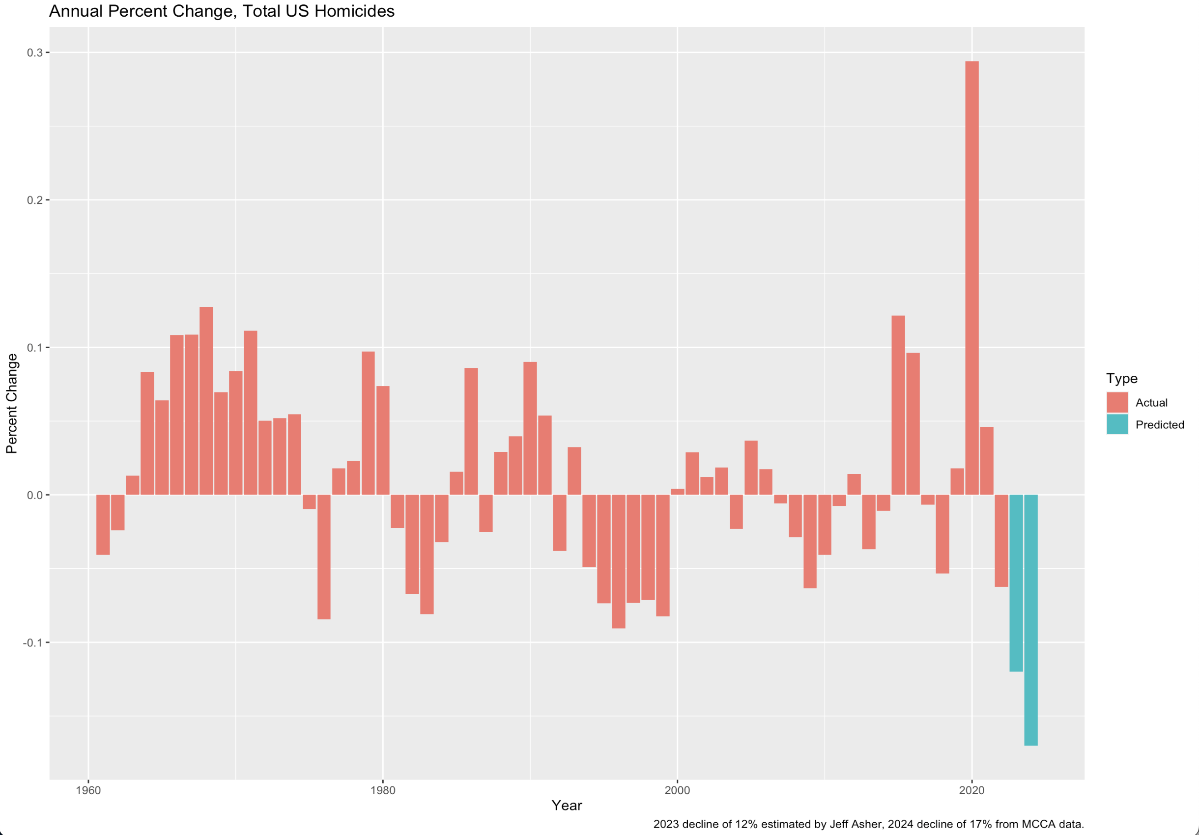 In early August, the Major Cities Chiefs Association released its annual midyear crime report for 2024 to little to no fanfare (I didn’t even see a press release posted on their website). The lack of hype is surprising, because the statistics are dramatic. Compared to the first half of 2023, homicides in the first half of 2024 are down 17%. If that holds to year-end, it’ll be the single biggest homicide decline since at least 1960; even if the decline is half that, 2024 is poised to cap off a three-year decline that will completely eliminate the entire 2020-21 Covid homicide spike (and then some).
