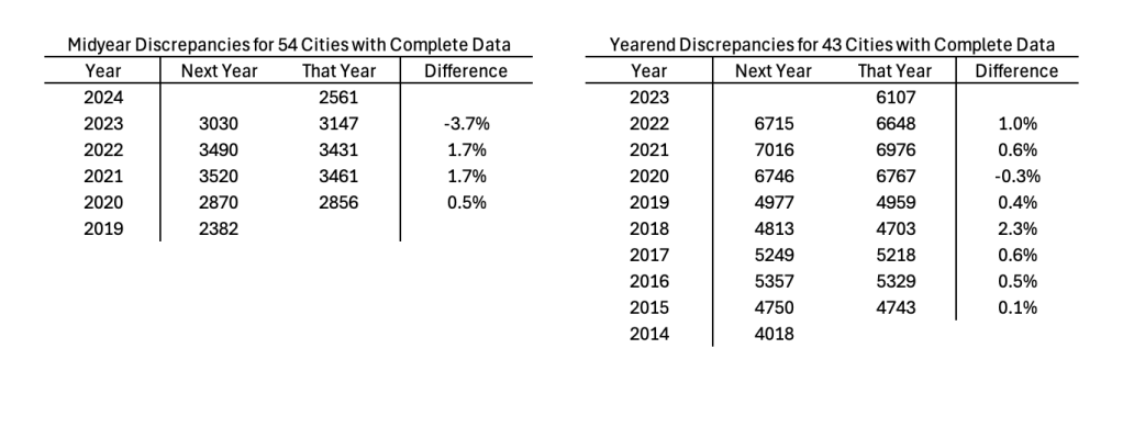 But the relatively minor aggregate discrepancies can mask some significant city-specific discrepancies. And it isn’t that specific cities are generally better or worse. The errors seem to be more randomly distributed. For example, in the midyear data, Philly’s numbers match perfectly, except for 2023’s: in the 2023 data, the PPD reports 211 homicides at midyear 2023, but in the 2024 data the midyear count for 2023 has fallen to 105. So is the decline to 61 in 2024 a 42% drop (from 105), or a 71% drop (from 211)?