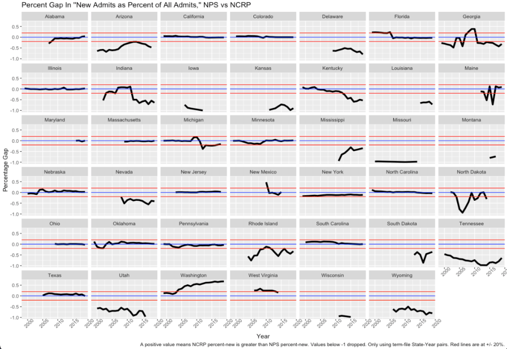 So here’s a simple look at things. For the states that provide consistent (“term-file”) data to the NCRP,1 here are graphs of the gaps between “percent of total admissions that are new admissions.” The red lines mark the +20%/-20% points. A value of, say, 5%, means that the percent-of-admits-that-are-new-admits in the NCRP are 5% higher than the same value in the NPS for that state in that year. Some states gaps of mostly zero: California, Colorado, New Jersey, New York by the end. But other states? Like Arizona, Tennessee, Washington? A lot more of a mess.