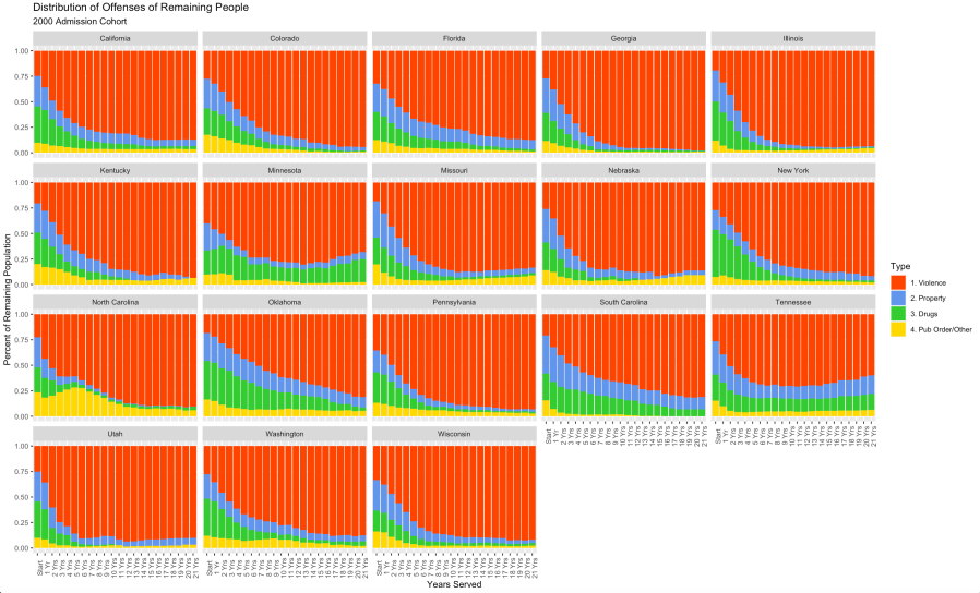 The final look (at least for now) of long sentences: what are those who have been in prison for decades but not yet released serving time for? And the answer, as before, is "a crime of violence."